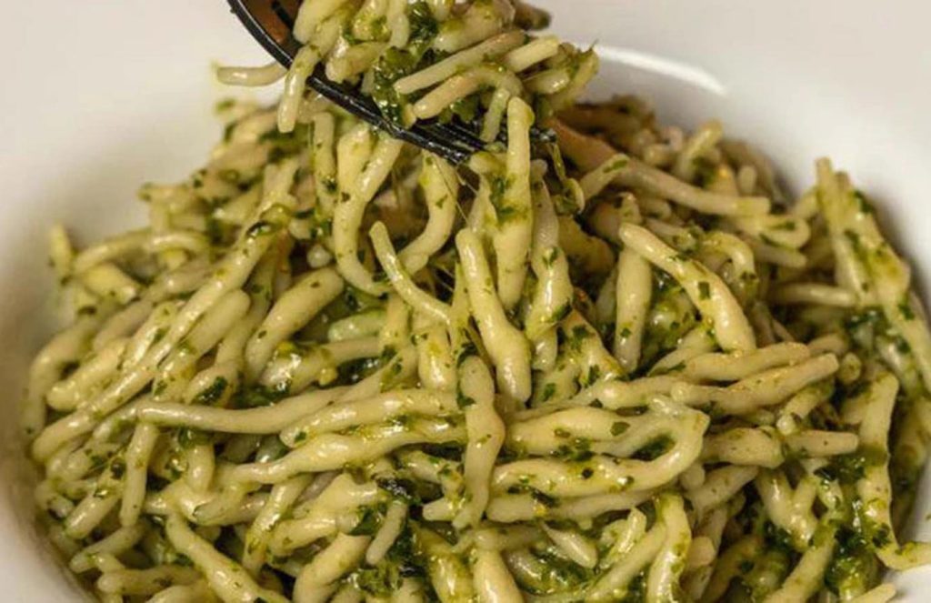 Italian Pesto alla Genovese: Pesto made with local fresh basil, pine nuts, garlic and Parmesan cheese, with a rich aroma, paired with handmade trofie noodles, with a chewy texture and rich and delicious sauce.